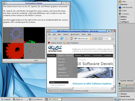 Advanced Graphics offers minimal software fallback for instrinsics. This puts more of an onnus on the hardware to provide the required capabilities, but also removes some of the " bureaucracy" associated with managing software fallbacks. Text output can be generated using Bitstream's Font Fusion 2.4 rendering subsystem directly, or by hooking into the font server provided by Photon. Advanced Graphics FAQ#Photon Photon is a microGUI is a small, powerful, and flexible widget and windowing environment. As of the QNX SDP 64x release, Photon is now underpinned with Advanced Graphics, where the majority of rendering primitives are shunted down to the Advanced Graphics interface. With this integration, applications can now be a hybrid of Photon and Advanced Graphics API calls, including OpenGL ES. A minimal windowing environment, with 2D and 3D support, can be easily accomplished in less than a 4 megabyte IFS (image file system).