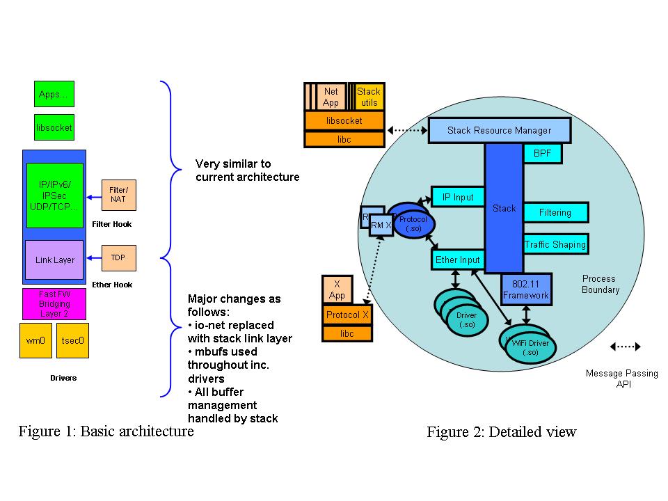 The io-pkt stack is very similar in architecture to other component subsystems inside of the Neutrino operating system. At the bottom layer (see Figure 1), drivers exist which provide the mechanism for passing data to and receive data from hardware. The drivers hook into a multi-threaded layer 2 component (that also provides fast forwarding and bridging capability) that ties them together and provides a unified interface into the layer 3 component which then handles the individual IP and upper layer protocol processing components (TCP and UDP). In Neutrino, a resource manager is layered on top of the stack. The resource manager acts as the message passing intermediary between the stack and user applications. It provides a standardized open/read/write/ioctl type of interface using a message stream to communicate with networking applications. Networking applications written by the user link with the socket library. The socket library converts the message passing interface exposed by the stack into a standard BSD style socket layer API which is the standard for most networking code today. One of the big differences that you will see with this stack as compared to io-net is that it isn't currently possible to decouple the layer 2 component from the IP stack. This was a tradeoff that was made to allow increased performance at the expense of some reduced versatility. We might look at enabling this at some point in the future if there's enough demand. In addition to the socket level API, there are also other, programmatic interfaces into the stack that are provided for other protocols or filtering to occur. These interfaces (used directly by TDP (aka QNET)) are very different from those provided by io-net so anyone using similar interfaces to these in the past will have to re-write them for io-pkt. A more detailed view of the io-pkt architecture is shown in Figure 2. At the driver layer, there are interfaces for Ethernet traffic (used by all ethernet drivers) and an interface into the stack for 802.11 management frames from wireless drivers. "hc" variants of the stack also include a separate hardware crypto API which allows the stack to use a crypto offload engine when it's encrypting / decrypting data for secure links. Drivers (built as DLLs for dynamic linking and prefixed with "devnp") are loaded into the stack using the "-d" option to io-pkt. APIs providing connection into the data flow at either the Ethernet or IP layer allow protocols to co-exist within the stack process. Protocols (such as QNET) are also built as DLLs. A protocol would link directly into either the IP or Ethernet layer and would run within the stack context. They are prefixed with "lsm" (loadable shared module) and are loaded into the stack using the "-p" option. The "tcpip" protocol (-ptcpip) is a special option that is recognized by the stack but it doesn't result in a protocol module being linked in (since the IP stack is already present). You still use the "-ptcpip" option to pass additional parameters to the stack that apply to the IP protocol layer (e.g. -ptcpip prefix=/alt to get the IP stack to register /alt/dev/socket as it's resource manager name). A protocol requiring interaction from an application sitting outside of the stack process may include its own resource manager infrastructure (this is what QNET does) to allow communications / configuration to occur. In addition to drivers and protocols, hooks for packet filtering and egress traffic shaping are also included in the stack. For filtering, there are two main interfaces supported. These are the Berkeley Packet Filter (BPF) interface (which is a socket level interface) and the PF (packet filter) interface (for more information, see the packet filtering page). BPF is a read / write (but not modify / block) packet interface that is accessed by using a socket interface at the application layer((see http://en.wikipedia.org/wiki/Berkeley_Packet_Filter). This is the interface of choice for basic, raw packet interception and transmission and gives applications outside of the stack process domain access to raw data streams. The other standard interface that's available for users is the "packet filtering" (PF) interface> It provides a read / write / modify / block interface. This gives complete control over which packets are received by or transmitted from the upper layers and is more closely related to the io-net "filter" API. Threading Model#The default mode of operation is for io-pkt to create one thread per CPU. The io-pkt stack is fully multi-threaded at Layer 2 while only one thread may acquire the "stack context" for upper layer packet processing or message request handling at any point in time. If multiple interrupt sources require servicing at the same time, these may be serviced by multiple threads. Only one thread will be servicing a particular interrupt source at any point in time. Typically an interrupt on a network device indicates there are packets to be received. The same thread that handles the receive processing may later transmit the received packets out another interface. Examples of this are layer 2 bridging and the "ipflow" fastforwarding of ip packets. The stack uses a thread pool to service events that are generated from other parts of the system. These events may be time outs, ISR events or other things generated by the stack or protocol modules. All of these threads are equivalent and operate in a floating priority mode (i.e. the thread priority matches that of the client application thread accessing the stack resource manager). Once a thread receives an event, it examines the event type to see if it's a HW event, stack event or "other" event. Given a HW event, the HW is serviced and, for a receive packet, the thread determines whether bridging or fast-forwarding is required and, if so, performs the appropriate lookup to determine to which interface the packet should be queued and then takes care of transmitting it. If the packet is meant