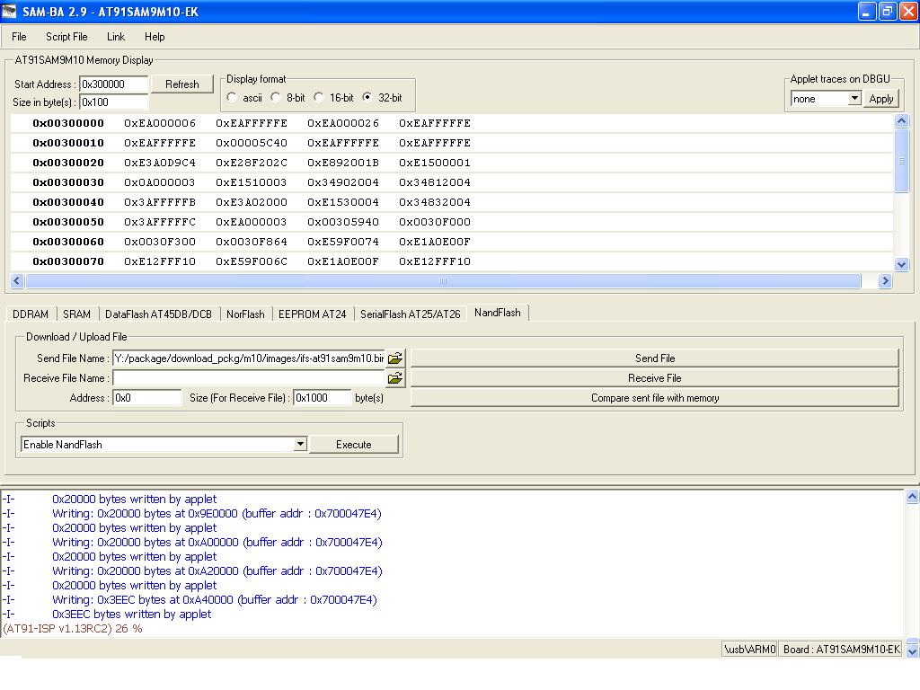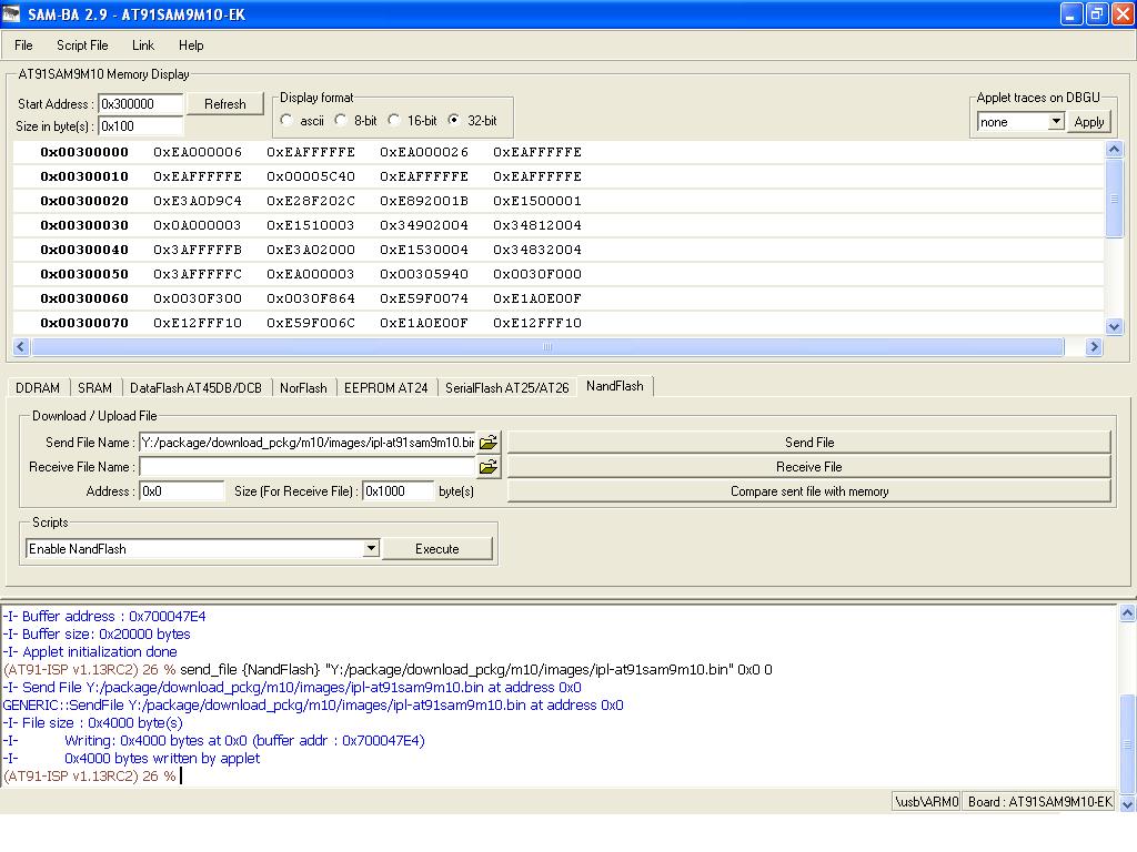 Install and setup SAM-BA#1. Install "Install AT91-ISP v1.13RC2.exe" . 2. Intall "ActiveTcl8.5.5.0.287690-win32-ix86-threaded.exe" i.e.TCL environment which is used by SAM-BA (any other TCL environment can also be used) . 3. Connect serial cable with windows machine, and use any serial port application such as teraterm or hyperterminal, and attach it with COM device, with baud rate set as 115200. 4. Restart the board and connect usb cable with windows machine. It will prompt with a new usb hardware found message, and will try to install the corresponding driver. 5. In case, a new usb hardware is not found. The followings sequence of operations should be done to fix ROMBoot on AT91SAM9M10-EK (Revision C) board: 5.1. Unplug power supply and unplug usb device cable from the board. 5.2. Remove jumper JP10 (NandFlash Chip Select) & JP12 (DataFlash Chip Select). 5.3. Plug serial cable, launch hyper terminal (115200 bauds, 8 bits, parity none, 1 stop bit, no flow control and then, plug power supply. 5.4. Type on hyper terminal : "Alt-0128 Alt-0128 #" and AT91SAM9M10-EK returns ">" . 5.5. Close hyper terminal and close jumper JP12 (DataFlash Chip Select). 5.6. Launch SAM-BA (Choose right COM port and AT91SAM9M10-EK). 5.7. Choose DataFlash media tab in the SAM-BA GUI interface. 5.8. Initialize DataFlash choosing the Enable action in the Scripts rolling menu and press Execute. 5.9. Choose Send boot file, press Execute. 5.10. Select AT91SAM9M11.bin binary file and press Open ; the media is written down 5.11. Close SAM-BA 6. Check device has enumerated properly by looking into device manager . 7. Start SAM-BA 2.9 with \usb\ARM0 as connection. Loading the IFS image using SAM-BA#