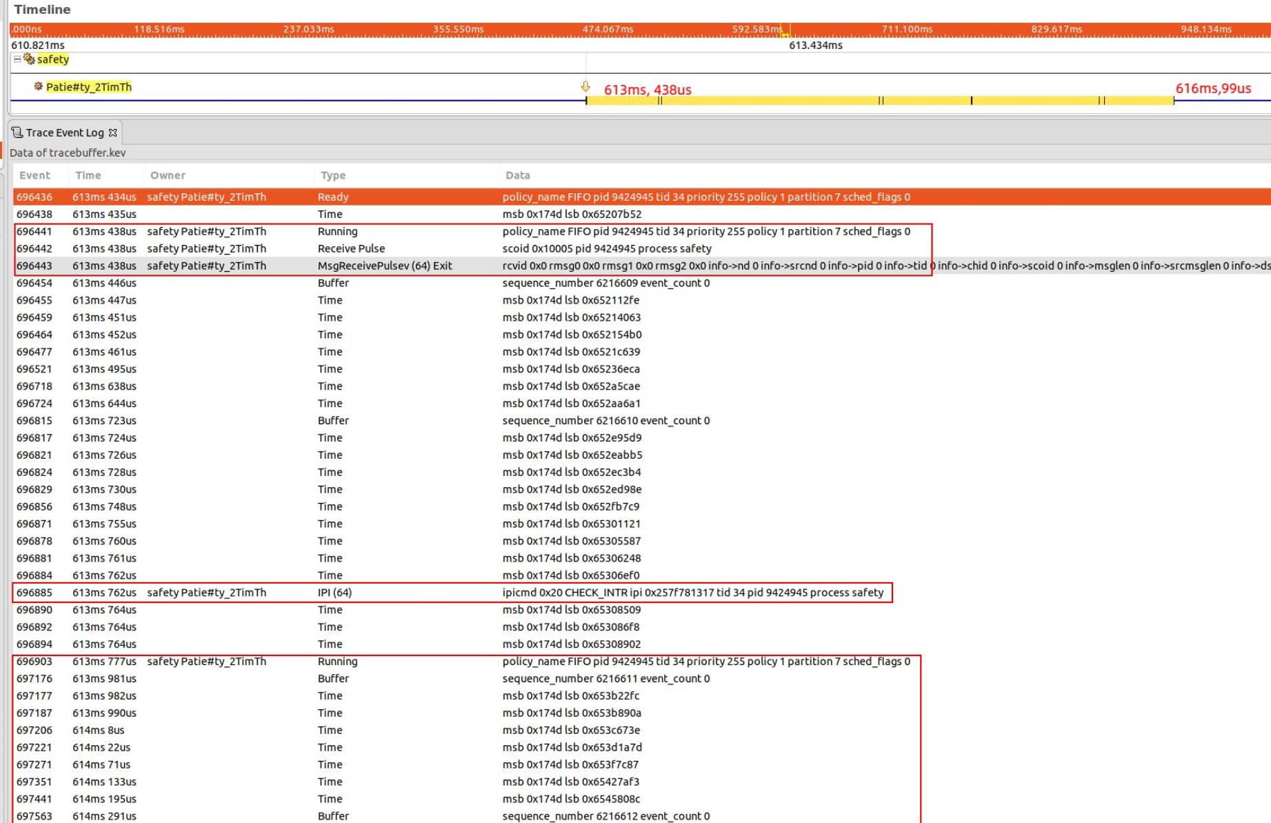 699846, 616ms 99us, 0x265A23AE1, 7, safety Patie#ty_2TimTh, Kernel Calls, MsgReceivePulsev (64) Enter, chid 0x9 rparts 1