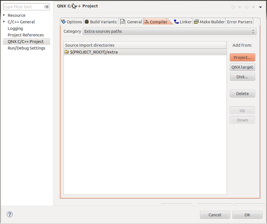 I have created a very small simple project, it is a QNX C/C++ project. It has the following structure: In the root