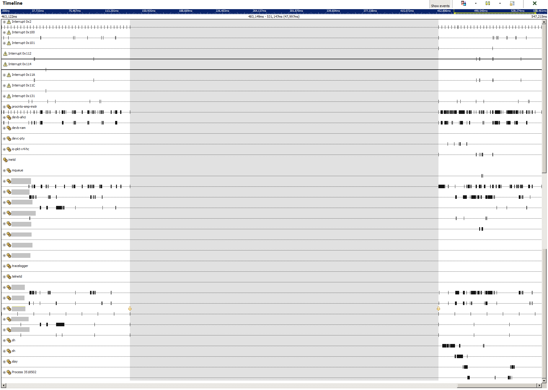 are no events in that time. The two user threads run on relatively low priority (30 and 6). Blocking by priority cannot