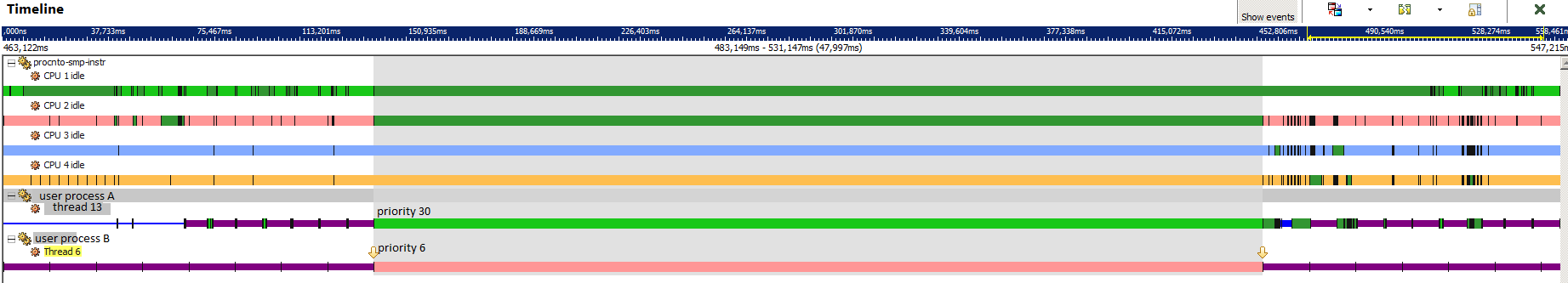 TimelineDetail.png shows the CPU 1 to 4 idle threads and two user threads which are running on CPU 1 and 2. Again there