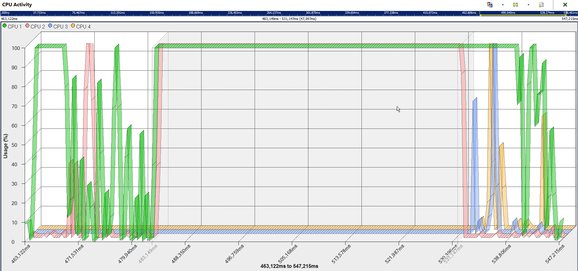 CpuActivity.png shows that CPU 1 and 2 are at 100% while CPU 3 and 4 are at 0 % during the whole time slot.