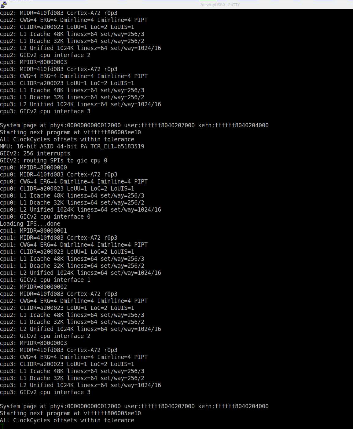 From startup where the first line is "MMU: 16-bit ASID..." it gets to the final line where it says"All ClockCycles
