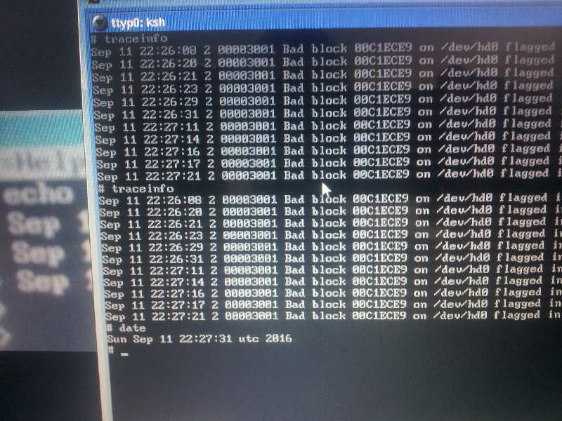 > "Sept 11 11:45:02 2 00003001 Bad Block 00C1ECE9 on /dev/hd0 flagged in cache"