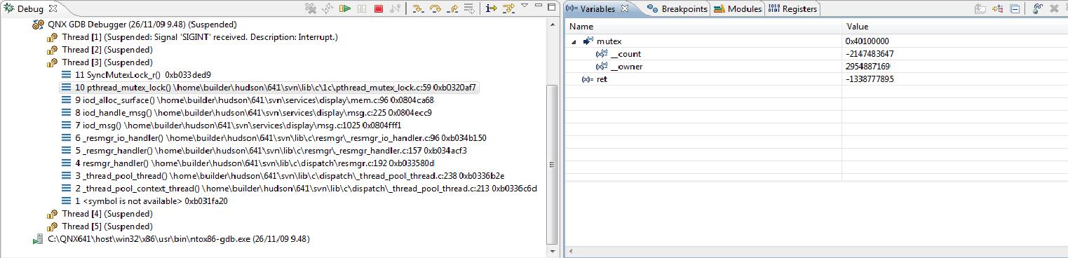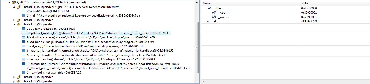 Looking on io-display I can see that one thread is waiting to lock a mutex. Seems that this mutex wasn't unlocked on the