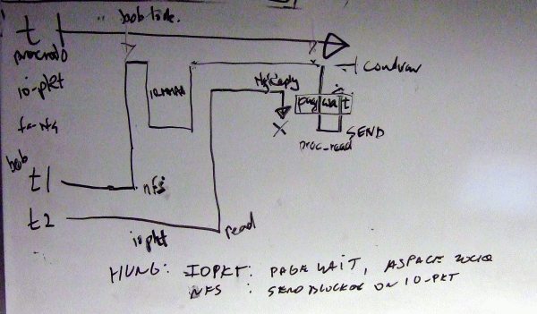 - bob2's read causes io-pkt to run but it faults on bob2's buffer, so enters page wait
