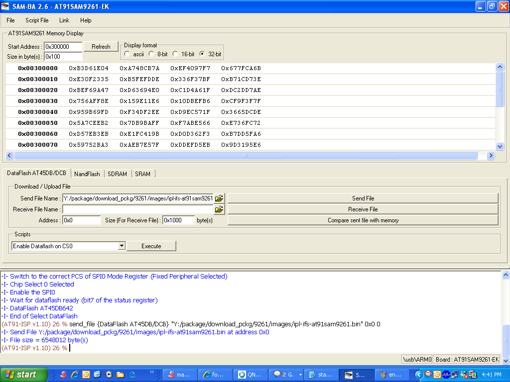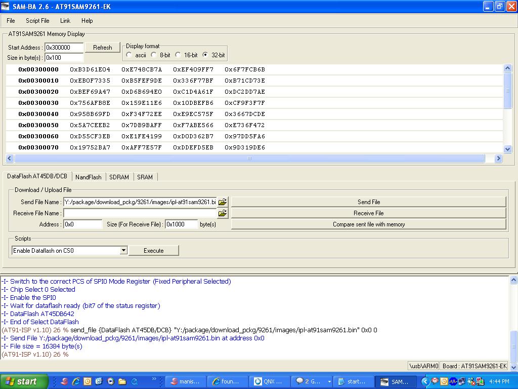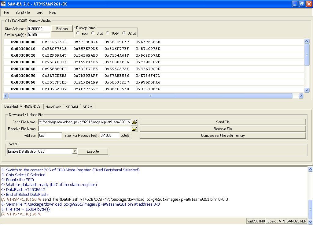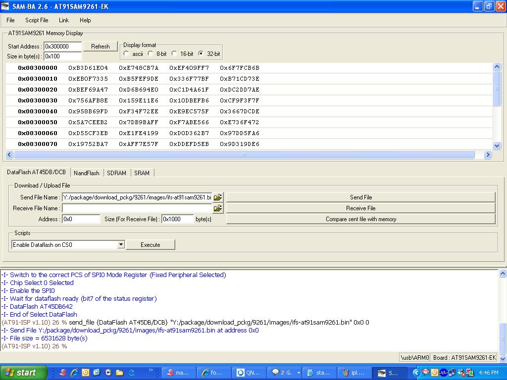 Install and setup SAM-BA#1. Install "AT91-ISP v1.12.exe" . 2. Intall "ActiveTcl8.5.5.0.287690-win32-ix86-threaded.exe" i.e.TCL environment which is used by SAM-BA (any other TCL environment can also be used) . 3. Connect serial cable with windows machine, and use any serial port application such as teraterm or hyperterminal, and attach it with COM device, with baud rate set as 115200. Remove jumper J21 . 4. Restart the board, hyperterminal will be showing following message . RomBOOT > 5. Connect usb cable with windows machine, It will prompt with a new usb hardware found message, and will try to install the corresponding driver . 6. Check device has enumerated properly by looking into device manager. Enable jumper J21 . 7. Start SAM-BA 2.6 with \usb\ARM0 as connection. Loading the IFS image using SAM-BA#