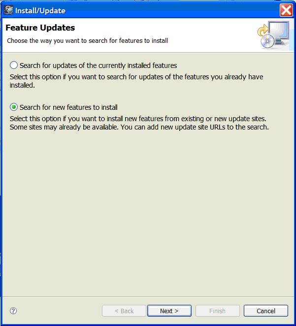 Click on the “Search for new features to install” radio button, then select “Next”. On the following dialog click on “New Remote Site…”, and then (in the URL field) enter: http://www.polarion.org/projects/subversive/download/1.1/update-site/. For the name field anything is fine, but “Subversive” might be a good choice. #