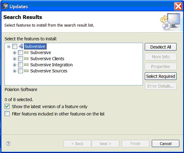 Check the highest level Subversive item (sub-items will check automatically), then un-check “Subversive Integration”, and click “Next”. On the next dialog, accept the terms of the license, and then click “Finish”. After a few moments the subversive software will be installed, and you will be prompted to re-start the workbench. Go ahead and say OK to re-starting the workbench.#